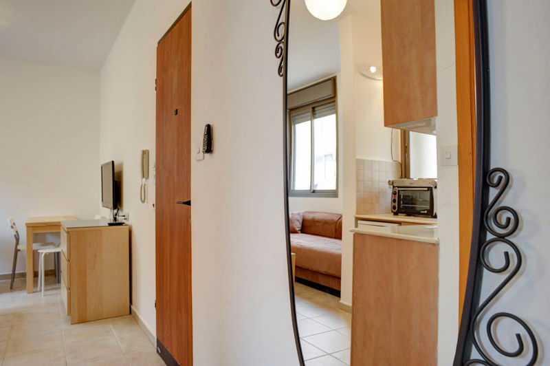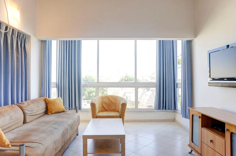 The suite composed from one bed room and one living room That can turn into a studio apartment The apartment size is 26 sq.m. In the living room there is a sofa that opens to 2 beds ,there is a kitchen , shower with toilet . The suites have a fully equipped kitchen with a dinning table and 2 chairs. The suites are with an air condition , 2 sets of LCD TV+ Satellite, wireless internet